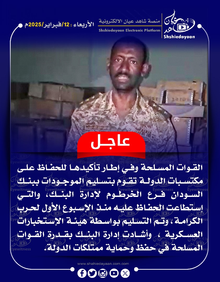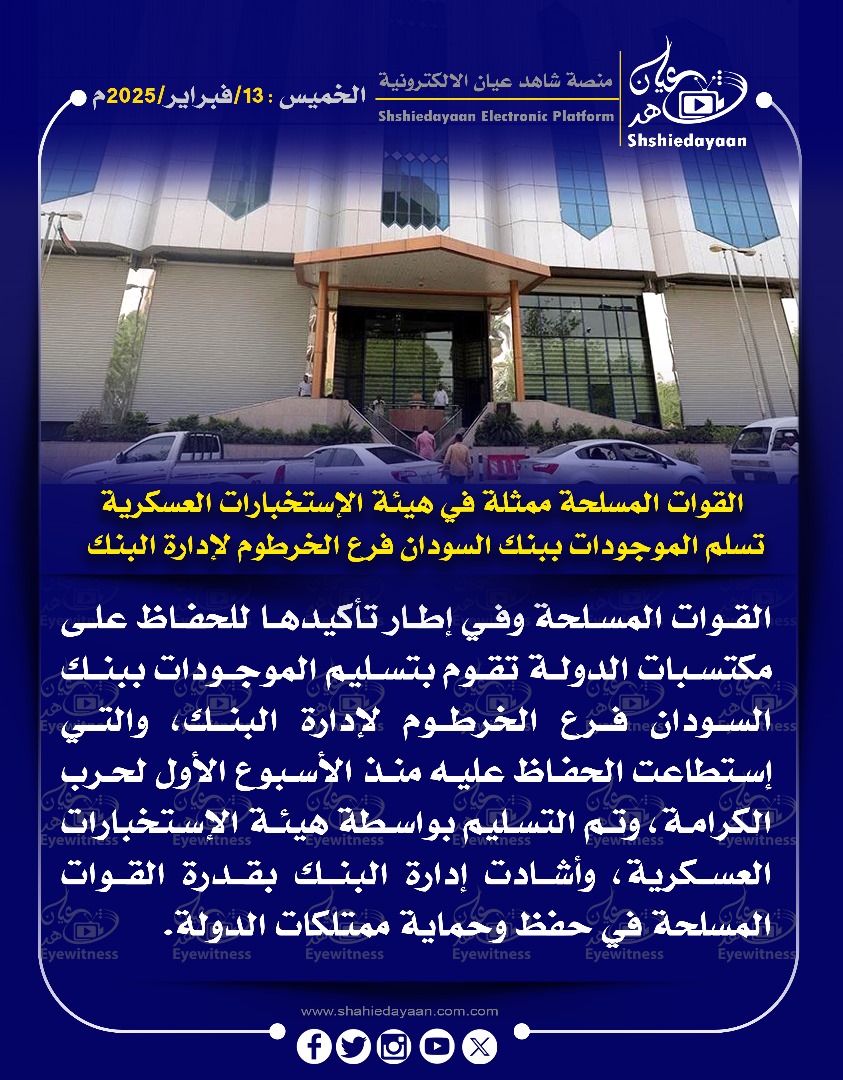 خبر في صورة الأخبار القوات المسلحة ممثلة في هيئة الإستخبارات العسكرية تسلم الموجودات ببنك السودان فرع الخرطوم لإدارة البنك شاهد عيان فبراير 13, 2025 0 أقرأ المزيد ..
