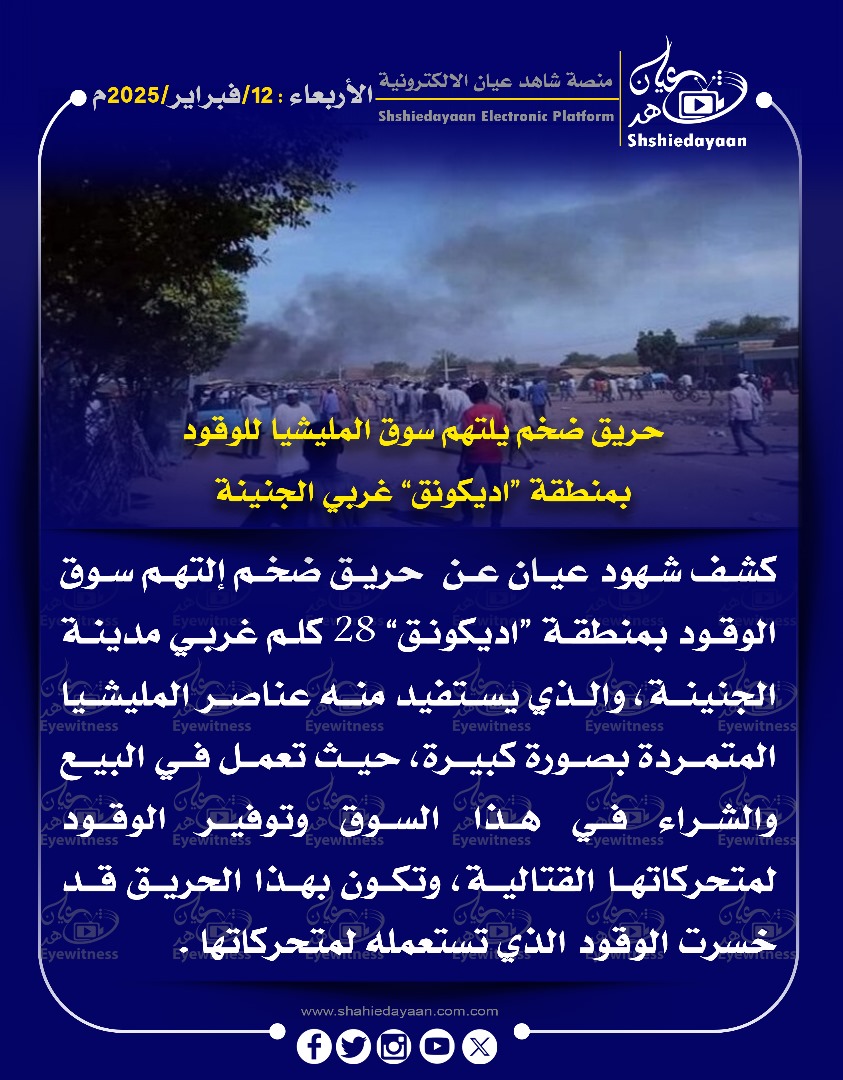 خبر في صورة حريق ضخم يلتهم سوق المليشيا للوقود بمنطقة “اديكونق غربي الجنينة شاهد عيان فبراير 12, 2025 0 أقرأ المزيد ..