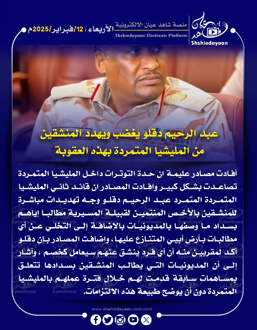 خبر في صورة عبد الرحيم دقلو يغضب ويهدد المنشقين من المليشيا المتمردة بهذه العقوبة شاهد عيان فبراير 12, 2025 0 أقرأ المزيد ..