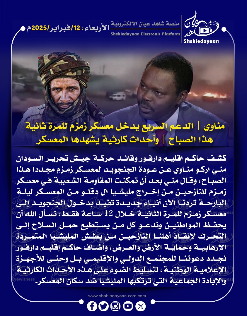 خبر في صورة مناوي | الدعم السريع يدخل معسكر زمزم للمرة ثانية هذا الصباح | وأحداث كارثية يشهدها المعسكر شاهد عيان فبراير 12, 2025 0 أقرأ المزيد ..