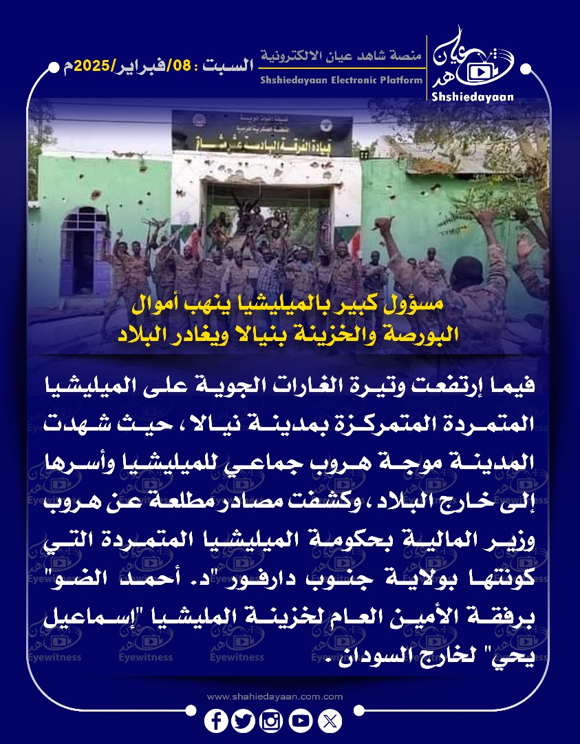 خبر في صورة الأخبار مسؤول كبير بالميليشيا ينهب أموال البورصة والخزينة بنيالا ويغادر البلاد شاهد عيان فبراير 8, 2025 0 أقرأ المزيد ..