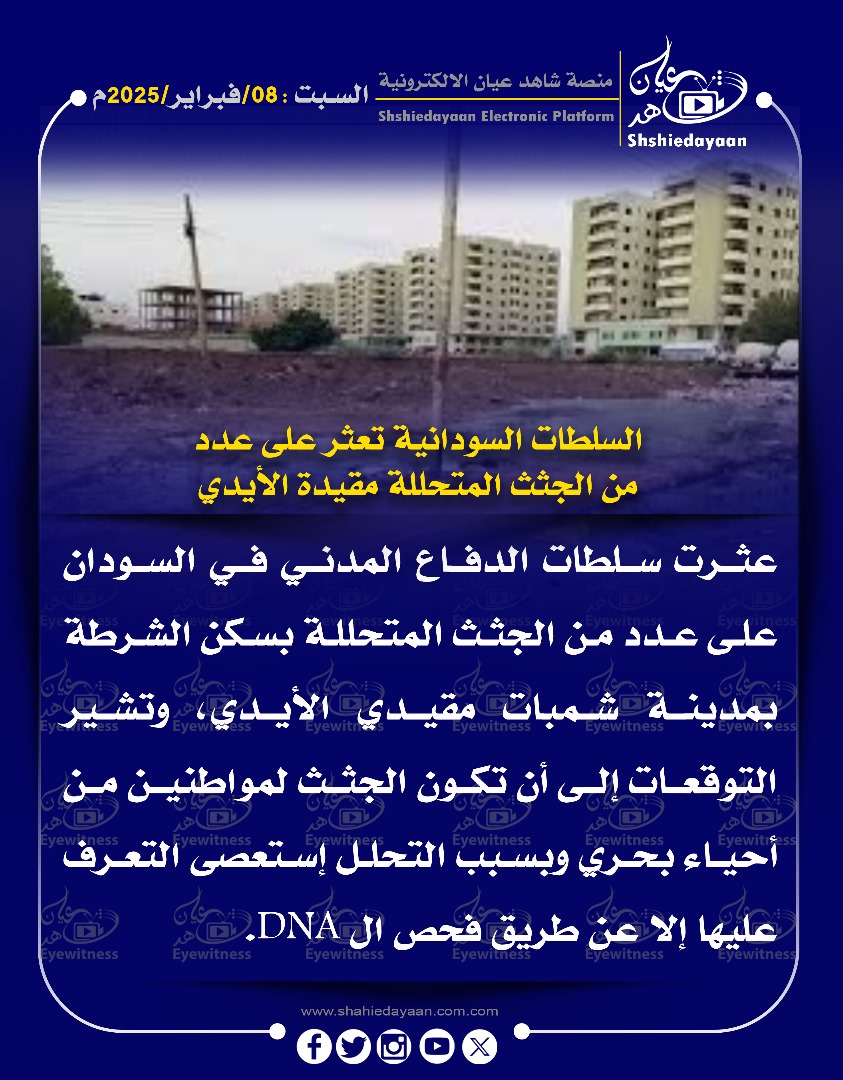 خبر في صورة الأخبار السلطات السودانية تعثر على عدد من الجثث المتحللة مقيدة الأيدي شاهد عيان فبراير 8, 2025 0 أقرأ المزيد ..