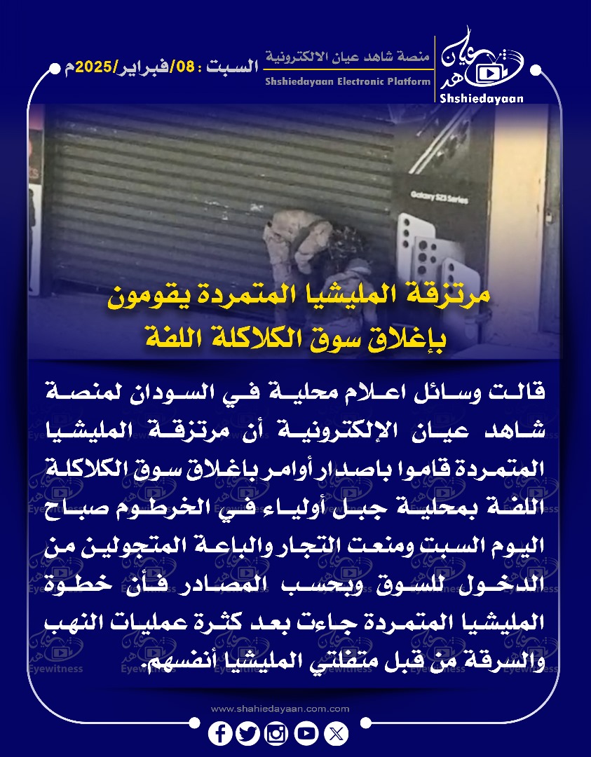 خبر في صورة الأخبار مرتزقة المليشيا المتمردة يقومون بإغلاق سوق الكلاكلة اللفة شاهد عيان فبراير 8, 2025 0 أقرأ المزيد ..