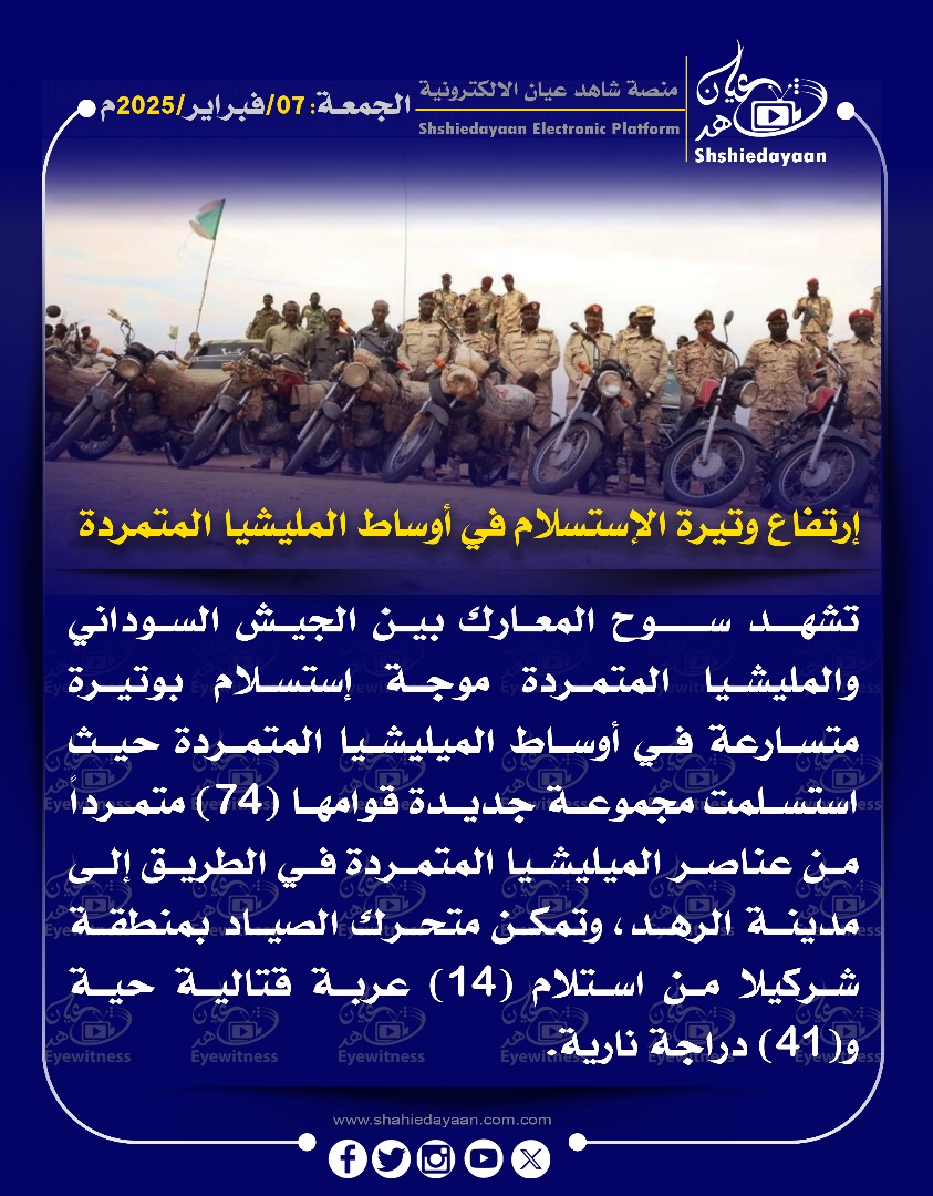خبر في صورة الأخبار إرتفاع وتيرة الإستسلام في أوساط المليشيا المتمردة شاهد عيان فبراير 7, 2025 0 أقرأ المزيد ..