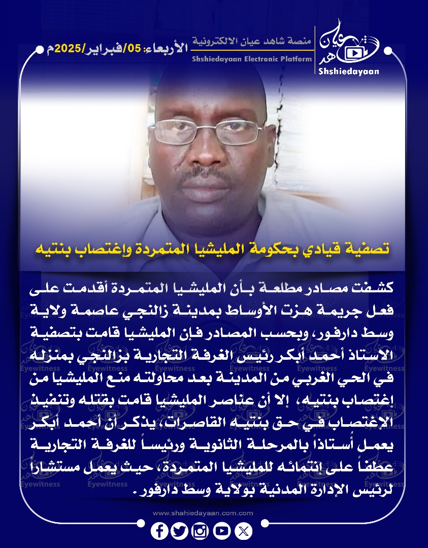 خبر في صورة الأخبار تصفية قيادي بحكومة المليشيا المتمردة واغتصاب بنتيه شاهد عيان فبراير 5, 2025 0 أقرأ المزيد ..