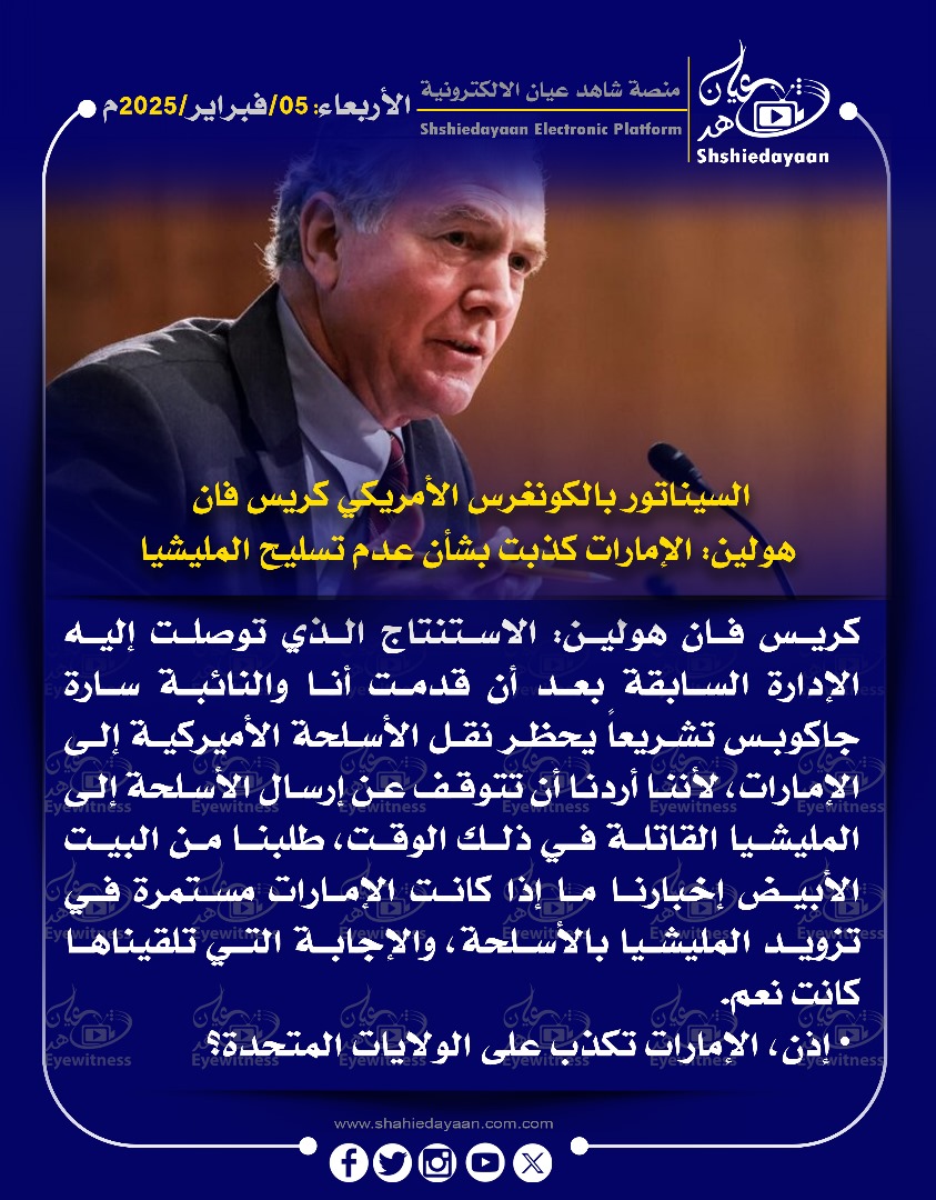 خبر في صورة الأخبار السيناتور بالكونغرس الأمريكي كريس فان هولين: الإمارات كذبت بشأن عدم تسليح المليشيا شاهد عيان فبراير 5, 2025 0 أقرأ المزيد ..