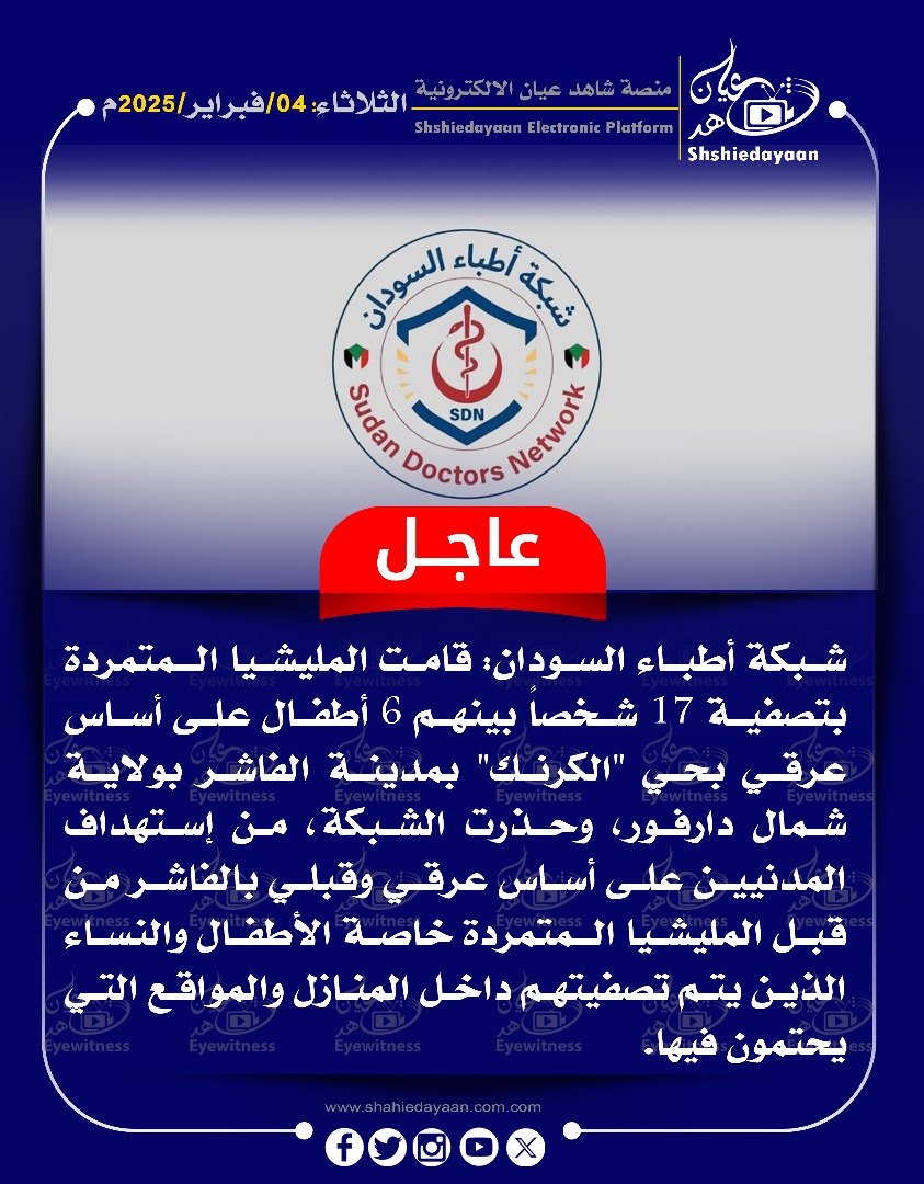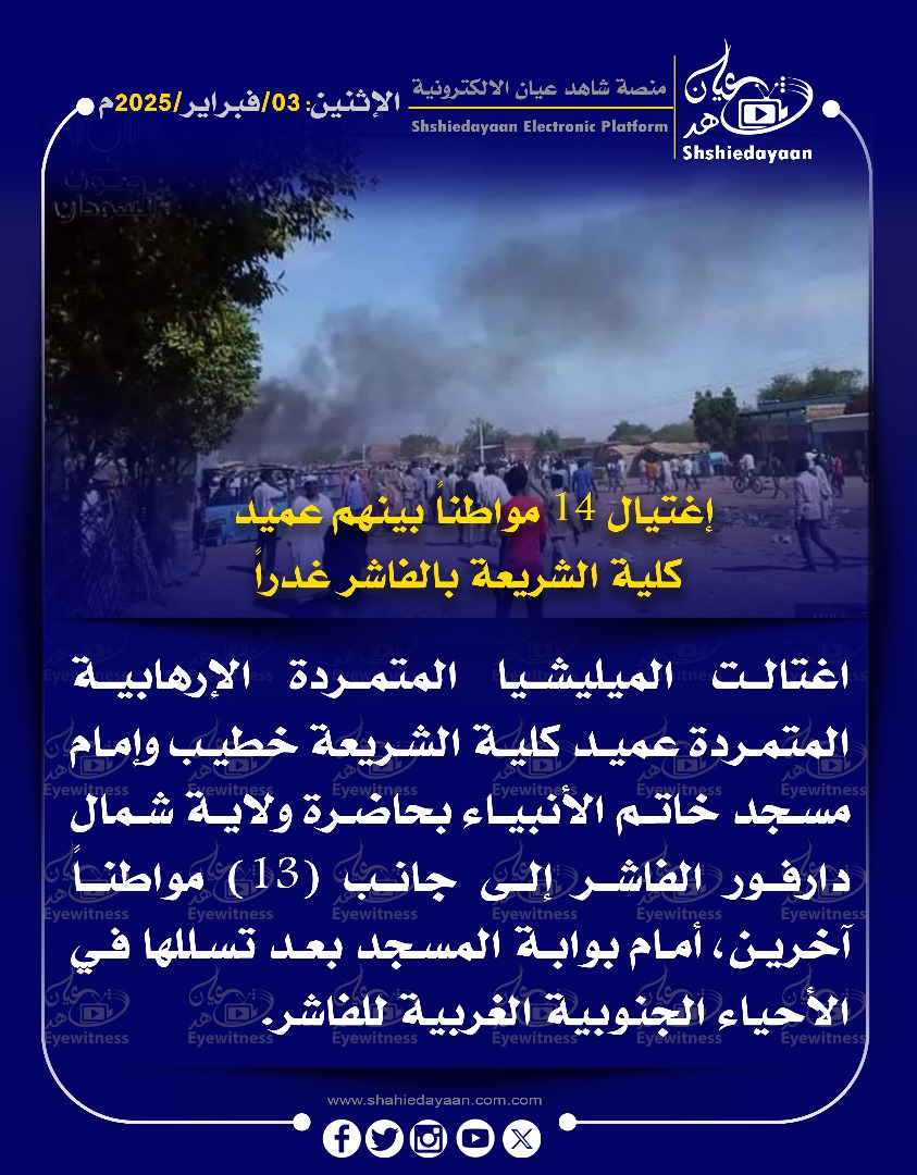 خبر في صورة الأخبار إغتيال 14 مواطنا بينهم عميد كلية الشريعة بالفاشر غدرا شاهد عيان فبراير 3, 2025 0 أقرأ المزيد ..