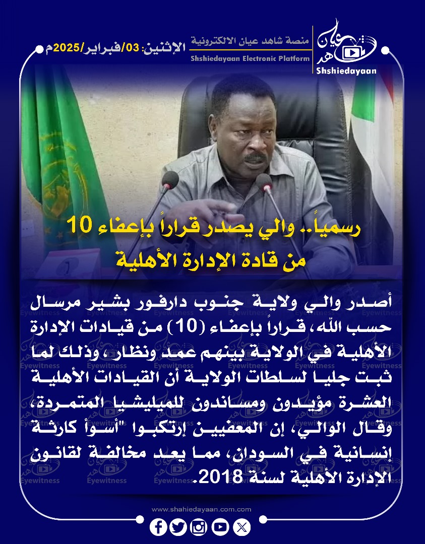 خبر في صورة الأخبار رسميا.. والي يصدر قرارا بإعفاء 10 من قادة الإدارة الأهلية شاهد عيان فبراير 3, 2025 0 أقرأ المزيد ..