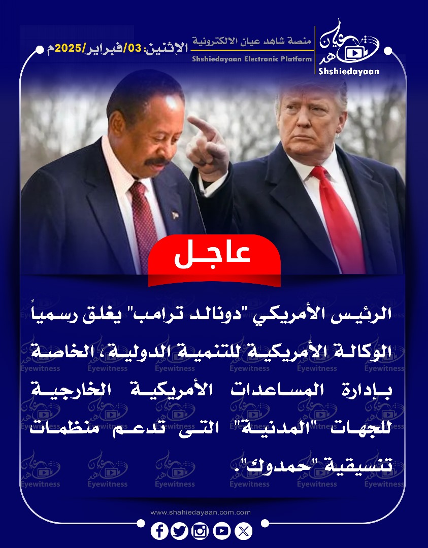 خبر في صورة الأخبار عاجل … الرئيس الأمريكي دونالد ترامب” يغلق رسمياً الوكالة الأمريكية للتنمية الدولية شاهد عيان فبراير 3, 2025 0 أقرأ المزيد ..