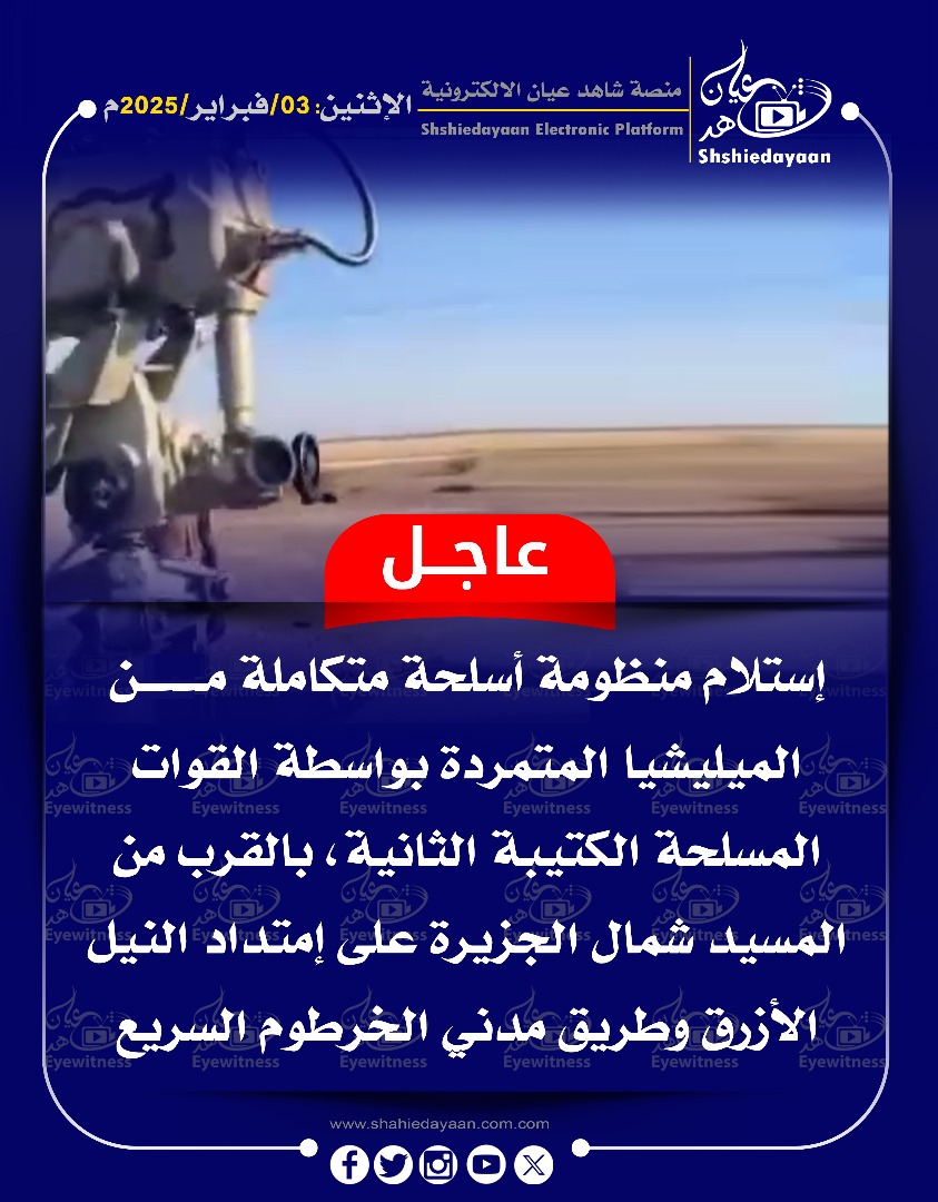 خبر في صورة الأخبار عاجل … إستلام منظومة أسلحة متكاملة من الميليشيا المتمردة بواسطة القوات المسلحة الكتيبة الثانية شاهد عيان فبراير 3, 2025 0 أقرأ المزيد ..