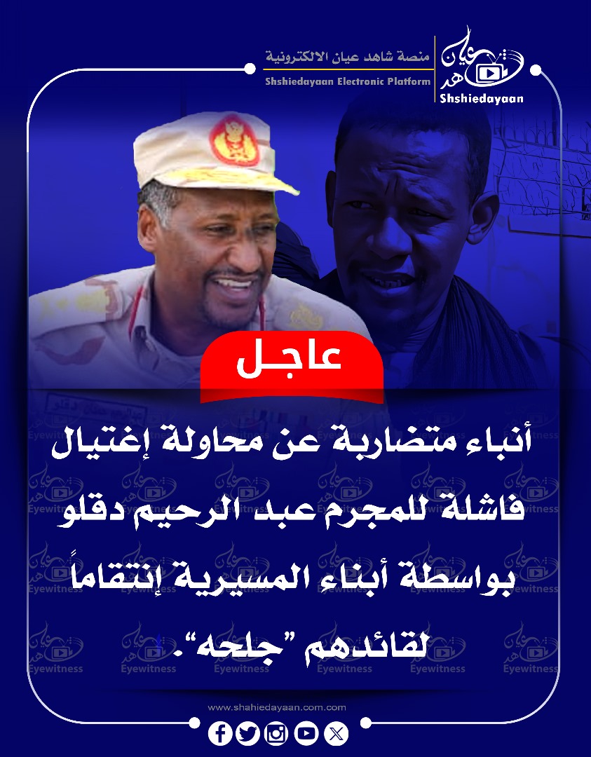 خبر في صورة الأخبار عاجل … أنباء متضاربة عن محاولة إغتيال فاشلة للمجرم عبد الرحيم دقلو شاهد عيان فبراير 3, 2025 0 أقرأ المزيد ..