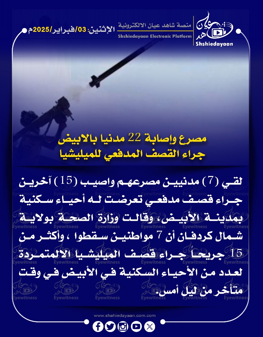 خبر في صورة الأخبار مصرع وإصابة 22 مدنيا بالابيض جراء القصف المدفعي للميليشيا شاهد عيان فبراير 3, 2025 0 أقرأ المزيد ..