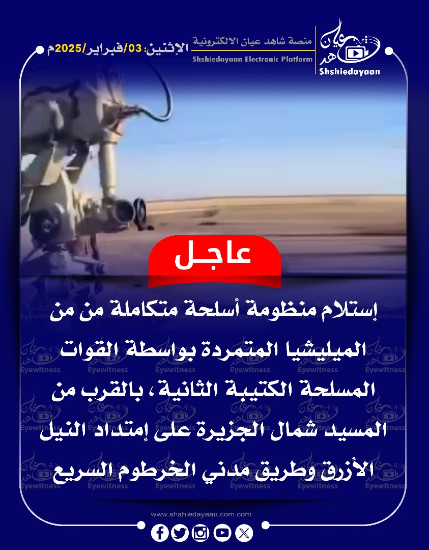 خبر في صورة الأخبار عاجل …. إستلام منظومة أسلحة متكاملة من من الميليشيا المتمردة شاهد عيان فبراير 3, 2025 0 أقرأ المزيد ..