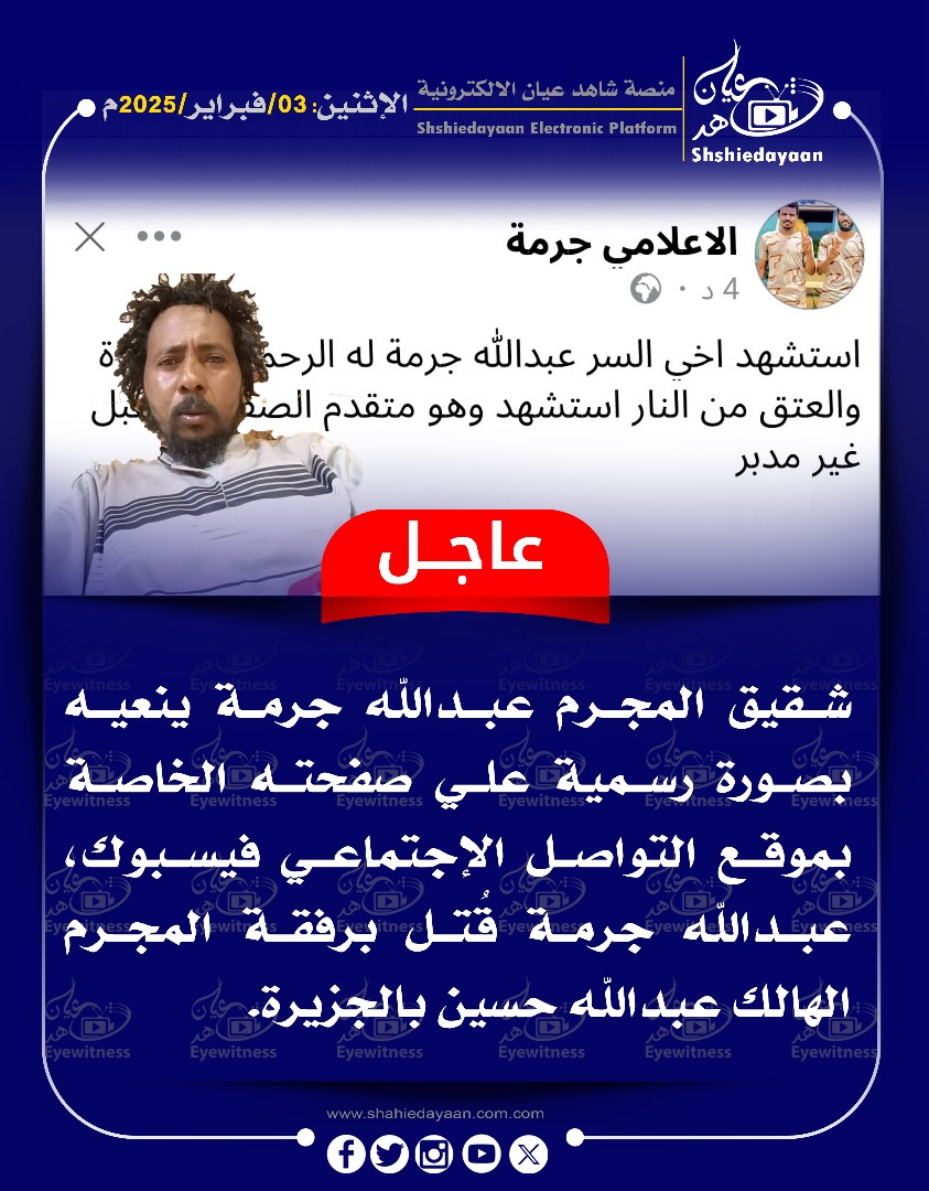 خبر في صورة الأخبار عاجل … شقيق المجرم عبد الله جرمة ينعيه بصورة رسمية علي صفحته الخاصة بموقع التواصل الإجتماعي فيسبوك شاهد عيان فبراير 3, 2025 0 أقرأ المزيد ..