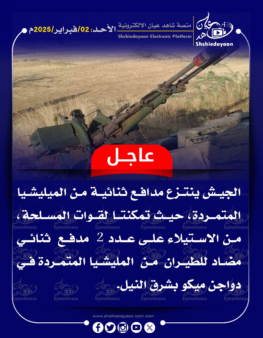خبر في صورة الأخبار الجيش ينتزع مدافع ثنائية من الميليشيا المتمردة، شاهد عيان فبراير 2, 2025 0 أقرأ المزيد ..