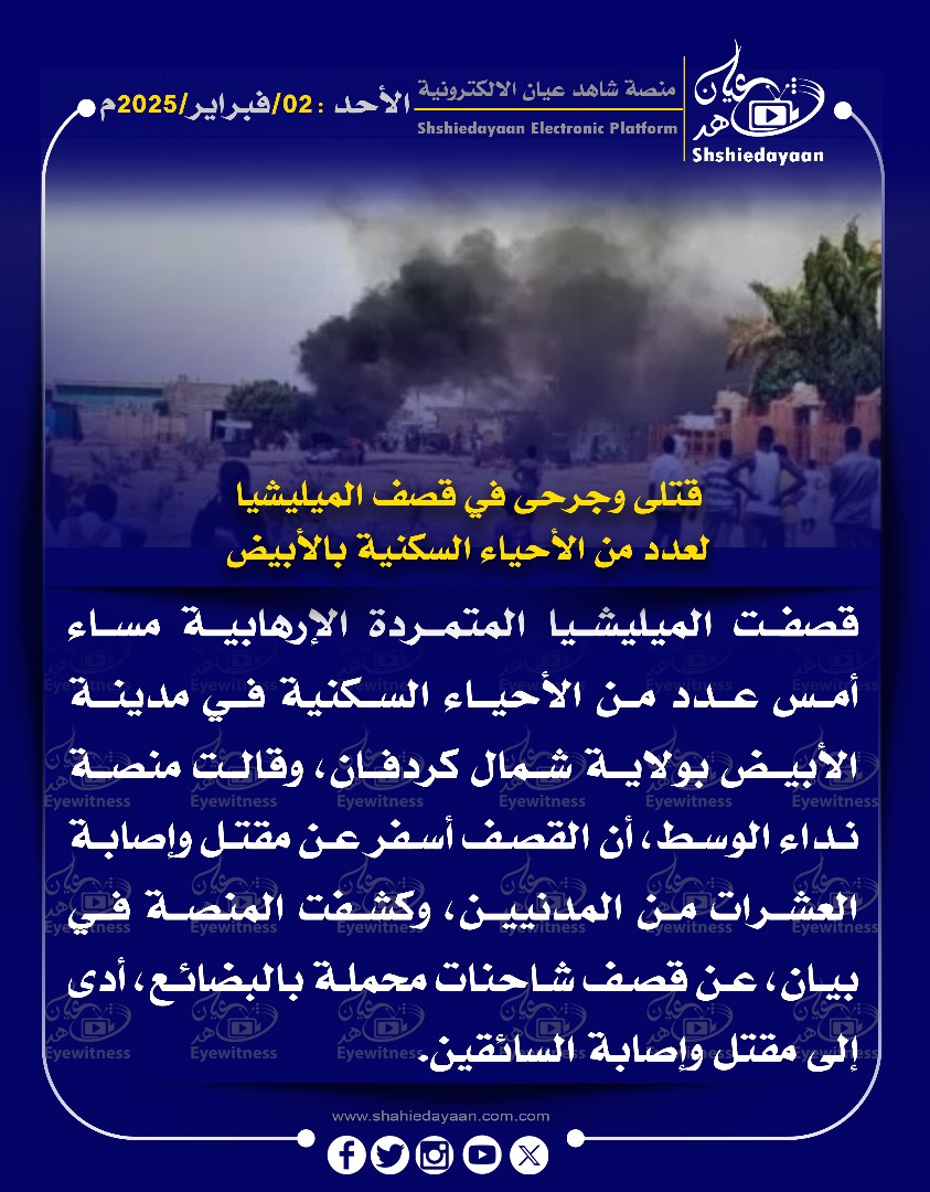 خبر في صورة الأخبار قتلى وجرحى في قصف الميليشيا لعدد من الأحياء السكنية بالأبيض شاهد عيان فبراير 2, 2025 0 أقرأ المزيد ..