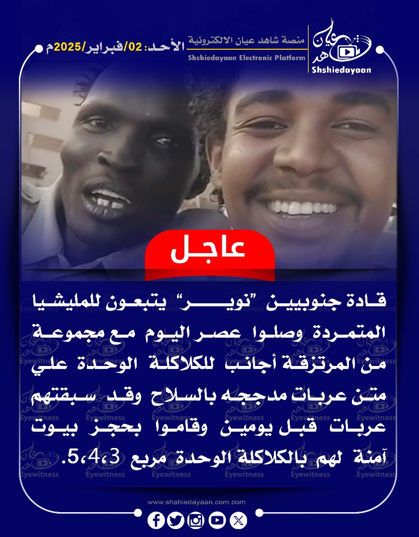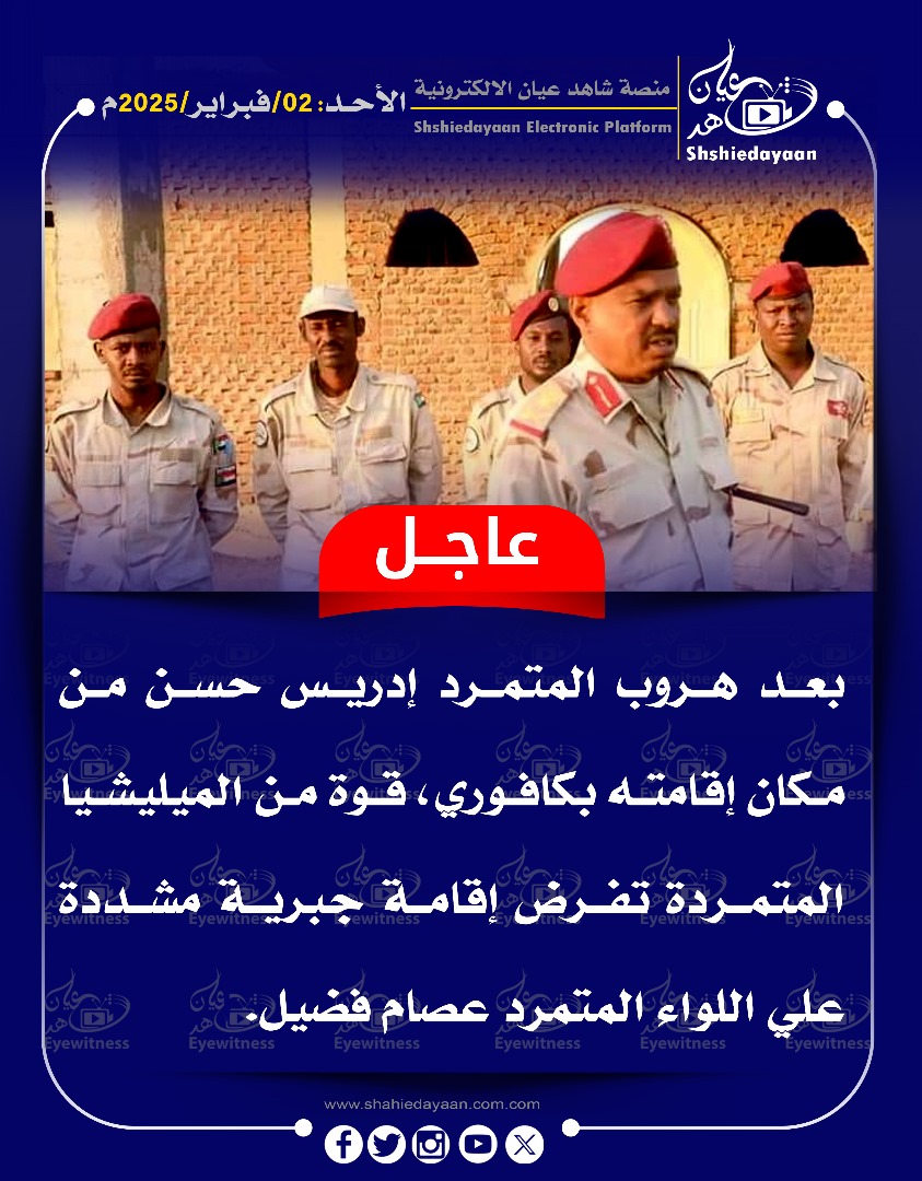 خبر في صورة الأخبار بعد هروب المتمرد إدريس حسن من مكان إقامته بكافوري ، قوة من الميليشيا المتمردة تفرض إقامة جبرية مشددة علي اللواء المتمرد عصام فضيل. شاهد عيان فبراير 2, 2025 0 أقرأ المزيد ..
