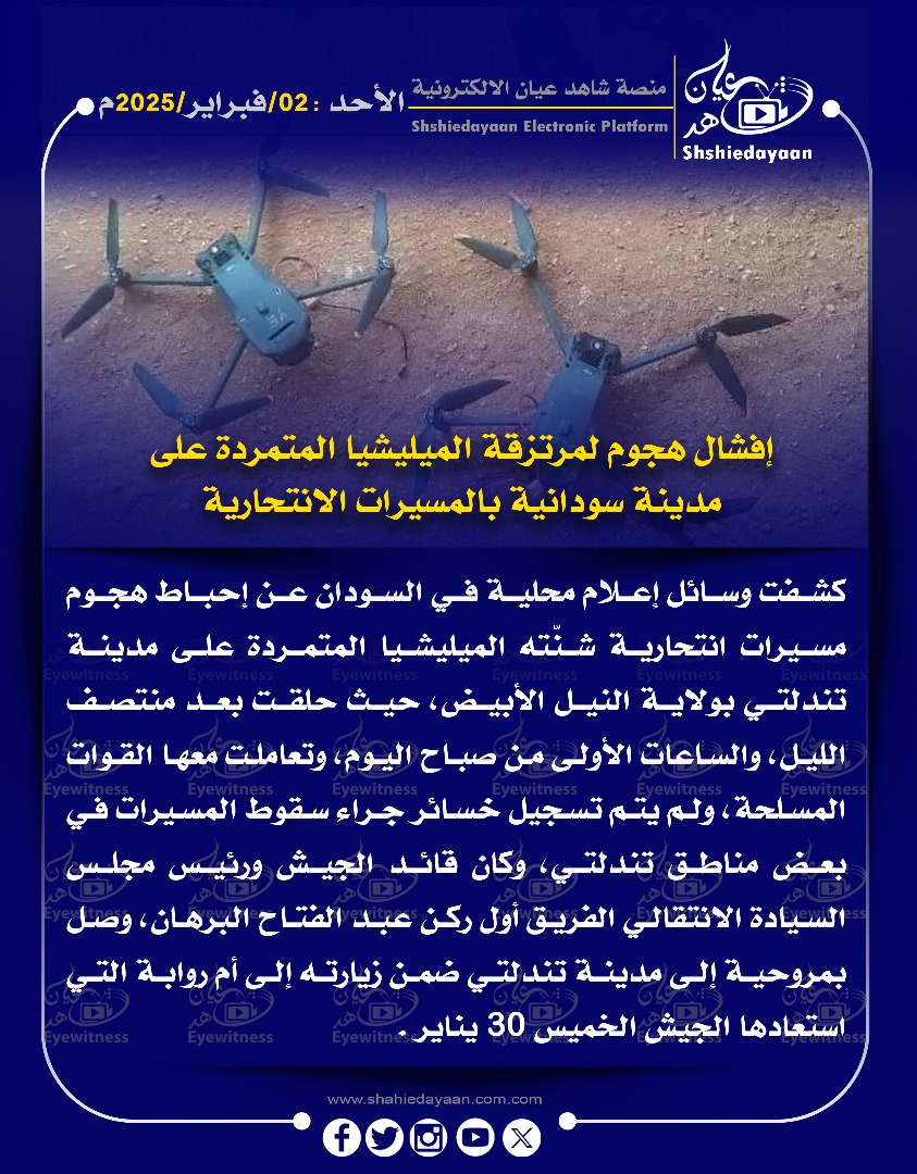 خبر في صورة الأخبار إفشال هجوم لمرتزقة الميليشيا المتمردة على مدينة سودانية بالمسيرات الانتحارية شاهد عيان فبراير 2, 2025 0 أقرأ المزيد ..
