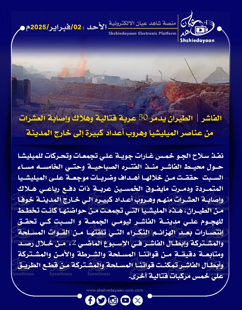 خبر في صورة الأخبار الفاشر | الطيران يدمر 50 عربة قتالية وهلاك وإصابة العشرات من عناصر الميليشيا وهروب أعداد كبيرة إلى خارج المدينة شاهد عيان فبراير 2, 2025 0 أقرأ المزيد ..