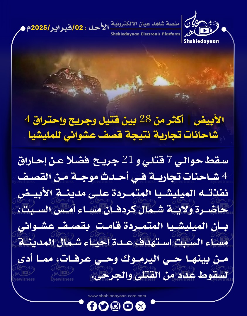 خبر في صورة الأخبار الأبيض | أكثر من 28 بين قتيل وجريح واحتراق 4 شاحانات تجارية نتيجة قصف عشوائي للمليشيا شاهد عيان فبراير 2, 2025 0 أقرأ المزيد ..