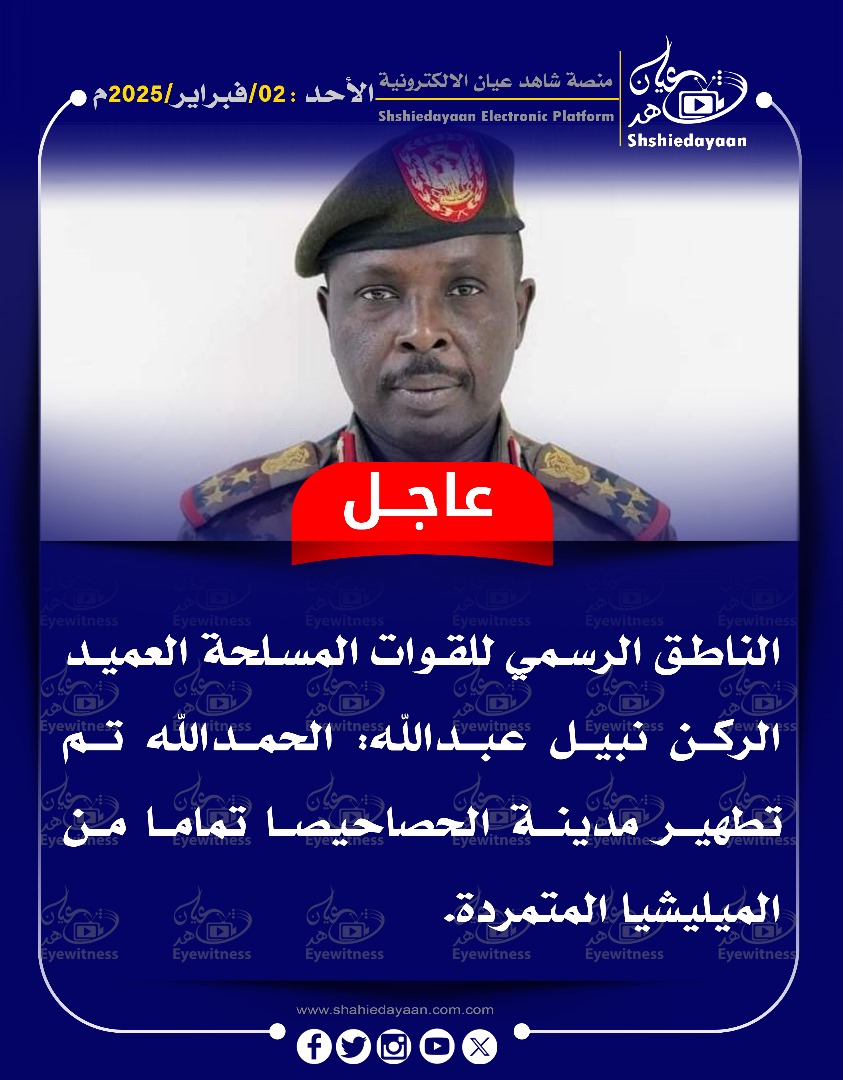 خبر في صورة الأخبار الناطق الرسمي للقوات المسلحة :تم تطهير مدينة الحصاحيصا تماما من الميليشيا المتمردة شاهد عيان فبراير 2, 2025 0 أقرأ المزيد ..
