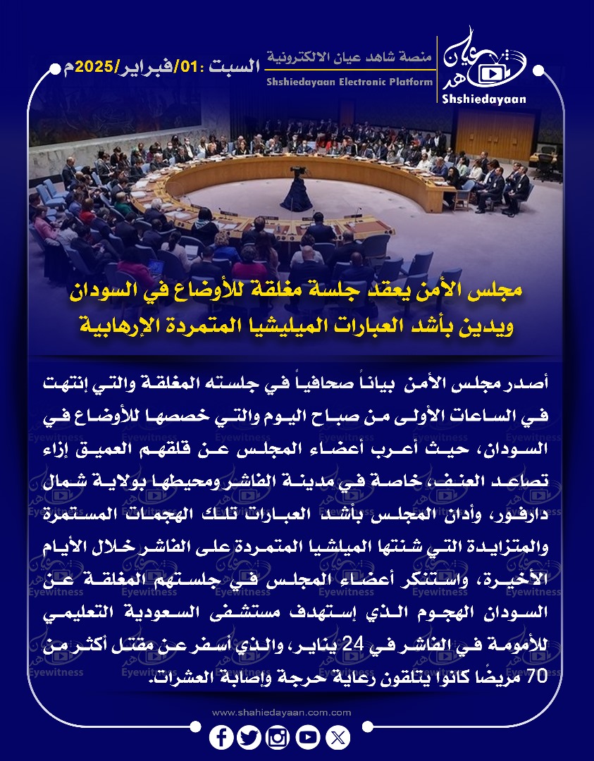 خبر في صورة الأخبار مجلس الأمن يعقد جلسة مغلقة للأوضاع في السودان ويدين بأشد العبارات الميليشيا المتمردة الإرهابية شاهد عيان فبراير 1, 2025 0 أقرأ المزيد ..