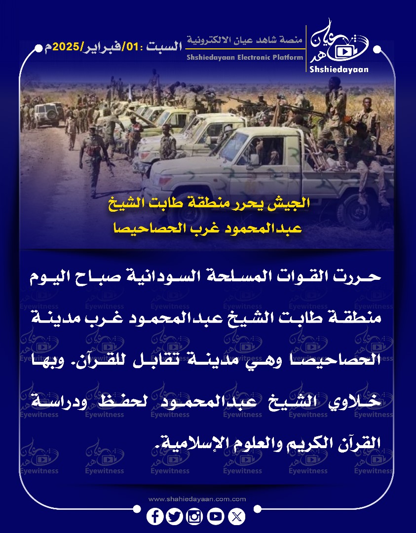 خبر في صورة الأخبار الجيش يحرر منطقة طابت الشيخ عبد المحمود غرب الحصاحيصا شاهد عيان فبراير 1, 2025 0 أقرأ المزيد ..