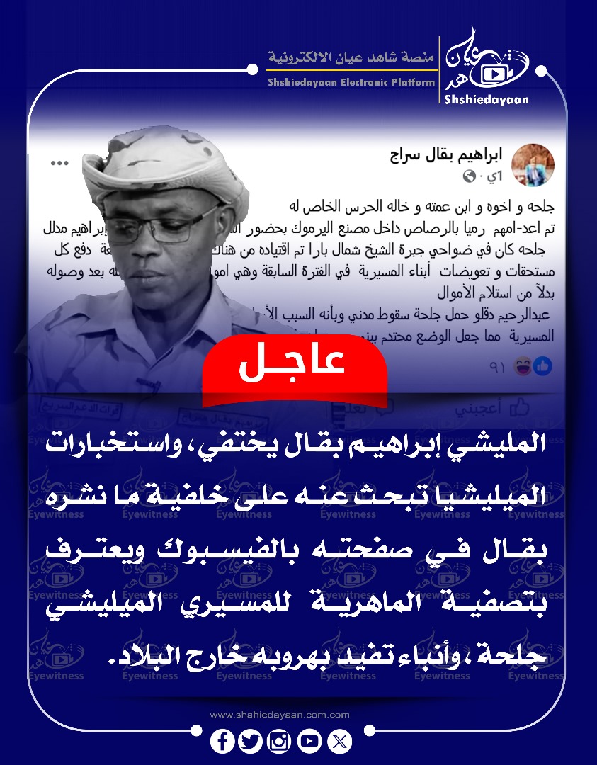 خبر في صورة الأخبار عاجل … المليشي إبراهيم بقال يختفي، واستخبارات الميليشيا تبحث عنه على خلفية ما نشره بقال في صفحته بالفيسبوك شاهد عيان فبراير 1, 2025 0 أقرأ المزيد ..