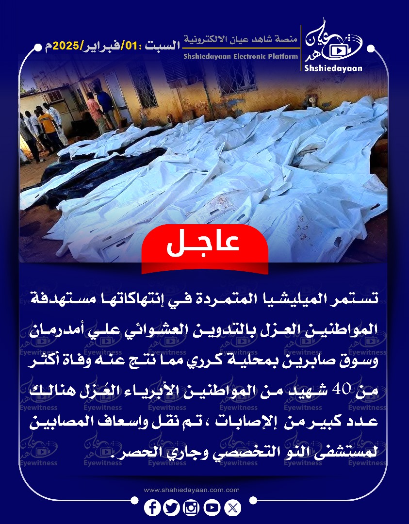 الأخبار خبر في صورة عاجل … تستمر الميليشيا المتمردة في إنتهاكاتها مستهدفة المواطنين العزل بالتدوين العشوائي علي أمدرمان شاهد عيان فبراير 1, 2025 0 أقرأ المزيد ..