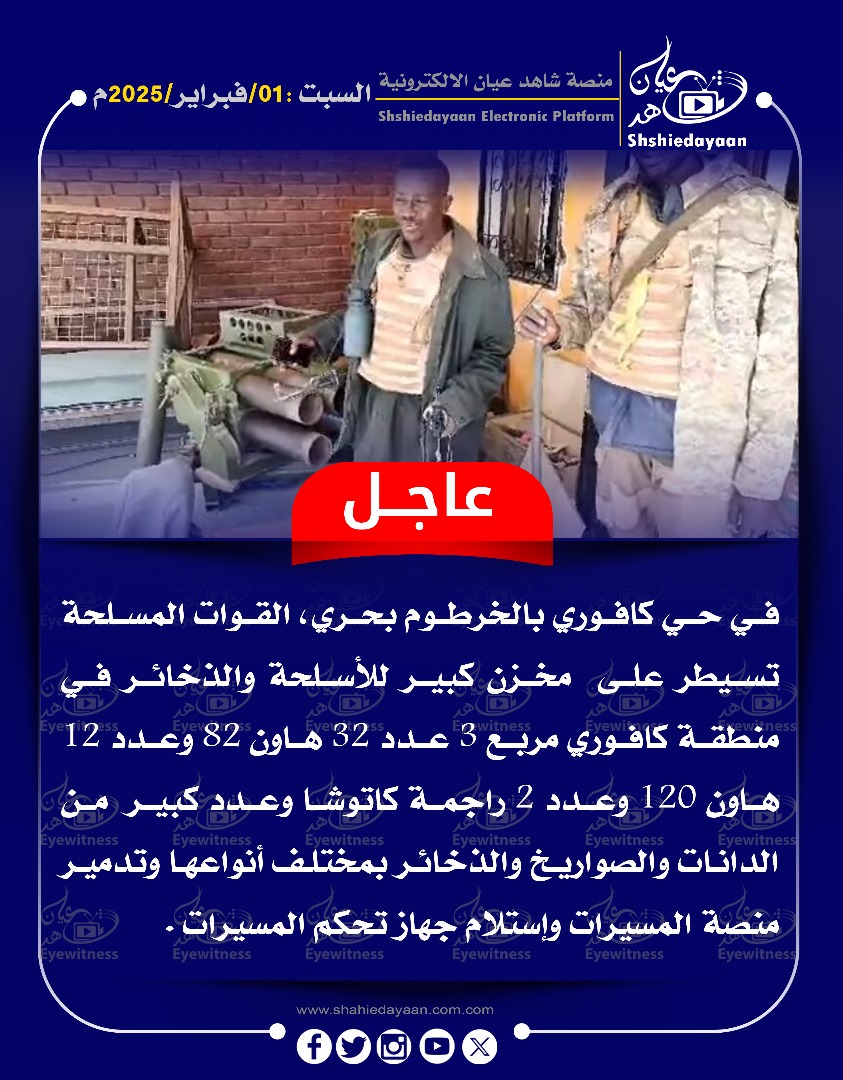 خبر في صورة الأخبار عاجل … في حي كافوري بالخرطوم بحري، القوات المسلحة تسيطر على مخزن كبير للأسلحة والذخائر في منطقة كافوري شاهد عيان فبراير 1, 2025 0 أقرأ المزيد ..