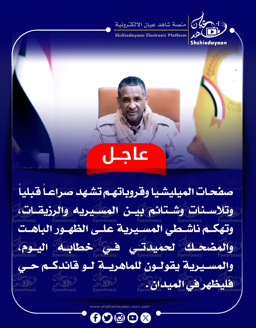 خبر في صورة الأخبار عاجل … صفحات الميليشيا وقروباتهم تشهد صراعاً قبلياً وتلاسنات وشتائم بين المسيريه والرزيقات شاهد عيان فبراير 1, 2025 0 أقرأ المزيد ..