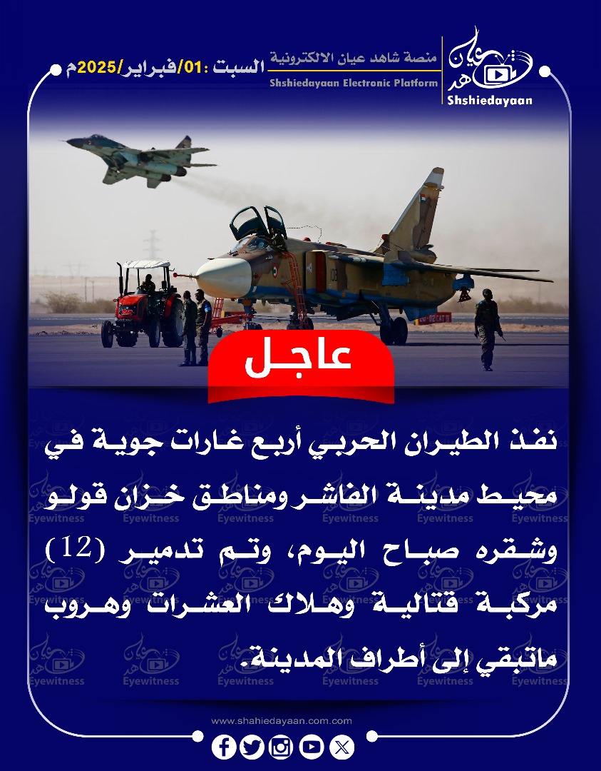 خبر في صورة الأخبار عاجل … نفذ الطيران الحربي أربع غارات جوية في محيط مدينة الفاشر ومناطق خزان قولو وشقره صباح اليوم شاهد عيان فبراير 1, 2025 0 أقرأ المزيد ..