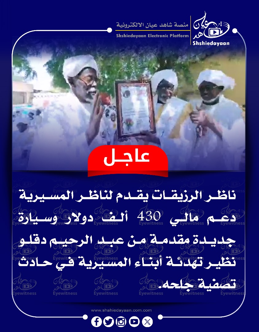 الأخبار خبر في صورة عاجل … ناظر الرزيقات يقدم لناظر المسيرية دعم مالي 430 ألف دولار وسيارة جديدة مقدمة من عبد الرحيم دقلو شاهد عيان فبراير 1, 2025 0 أقرأ المزيد ..