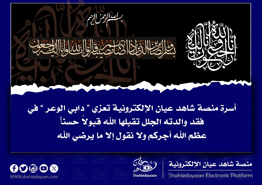خبر في صورة الأخبار أسرة منصة شاهد عيان الإلكترونية تعزي ” دابي الوعر ” في فقد والدته الجلل تقبلها الله قبولاً حسناً شاهد عيان يناير 31, 2025 0 (نـــــعـــــي) “يَا أَيَّتُهَا النَّفْسُ الْمُطْمَئِنَّةُ ارْجِعِي إِلَى رَبِّكِ رَاضِيَةً مَرْضِيَّةً فَادْخُلِي فِي عِبَادِي وَادْخُلِي جَنَّتِي“ أسرة منصة شاهد عيان الإلكترونية… أقرأ المزيد ..