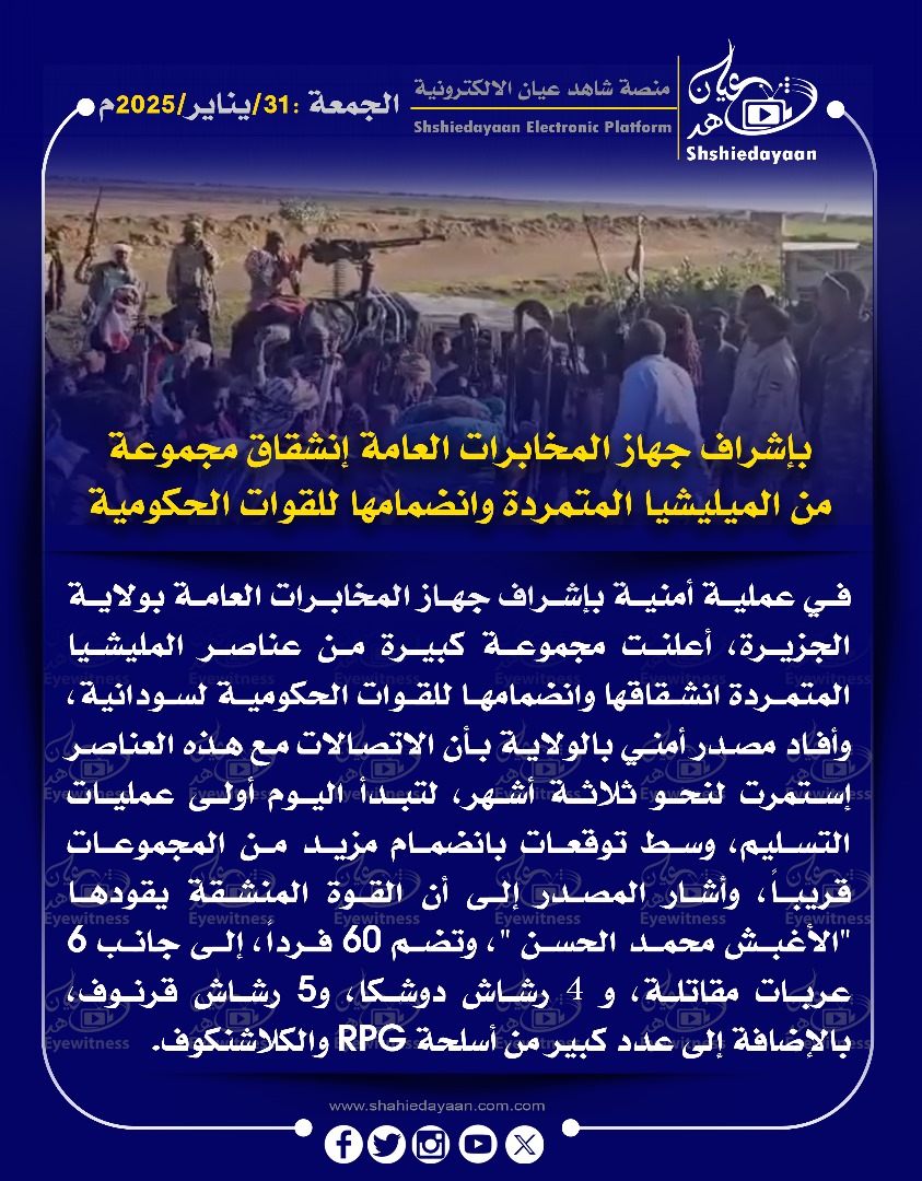 خبر في صورة الأخبار بإشراف جهاز المخابرات العامة إنشقاق مجموعة من الميليشيا المتمردة وانضمامها للقوات الحكومية شاهد عيان يناير 31, 2025 0 أقرأ المزيد ..