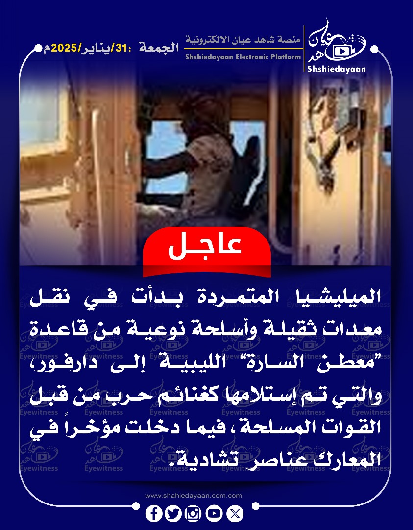 خبر في صورة الأخبار في نقل معدات ثقيلة وأسلحة نوعية من قاعدة معطن “السارة الليبية إلى دارفور شاهد عيان يناير 31, 2025 0 أقرأ المزيد ..