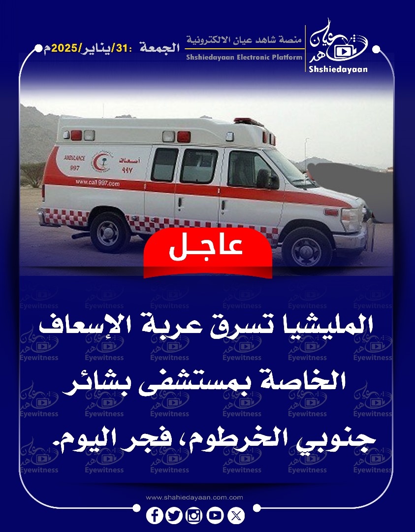 خبر في صورة الأخبار المليشيا تسرق عربة الإسعاف الخاصة بمستشفى بشائر شاهد عيان يناير 31, 2025 0 أقرأ المزيد ..