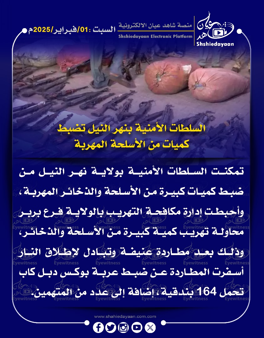 خبر في صورة الأخبار السلطات الأمنية بنهر النيل تضبط كميات من الأسلحة المهربة شاهد عيان فبراير 1, 2025 0 أقرأ المزيد ..