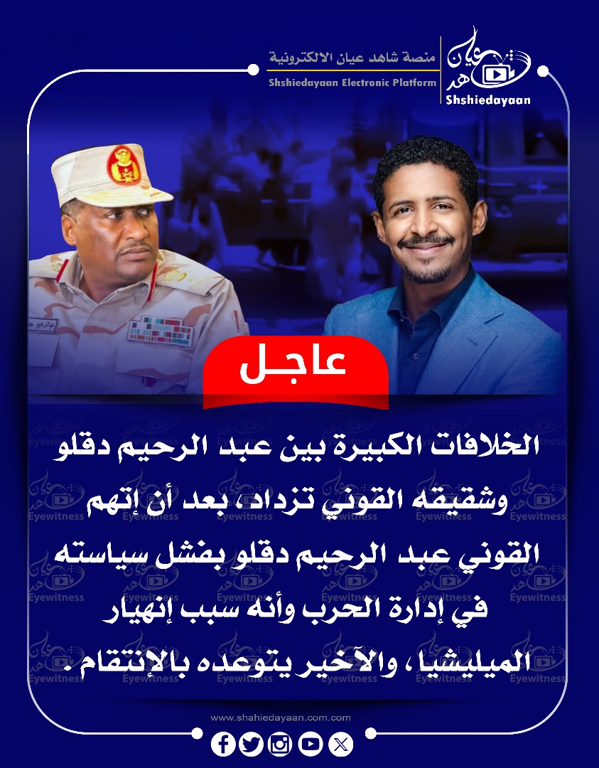 خبر في صورة الأخبار الخلافات الكبيرة بين عبد الرحيم دقلو وشقيقه القوني تزداد، شاهد عيان يناير 30, 2025 0 أقرأ المزيد ..
