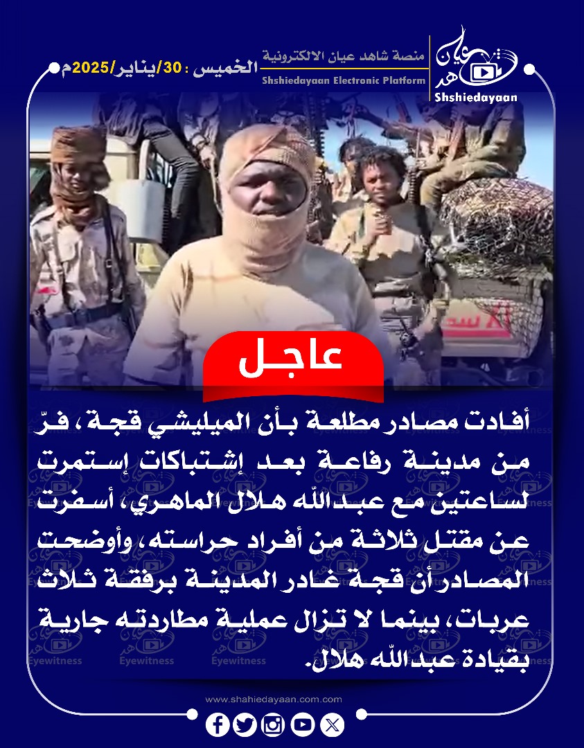 خبر في صورة الأخبار أفادت مصادر مطلعة بأن الميليشي قجة ، فر من مدينة رفاعة شاهد عيان يناير 30, 2025 0 أقرأ المزيد ..