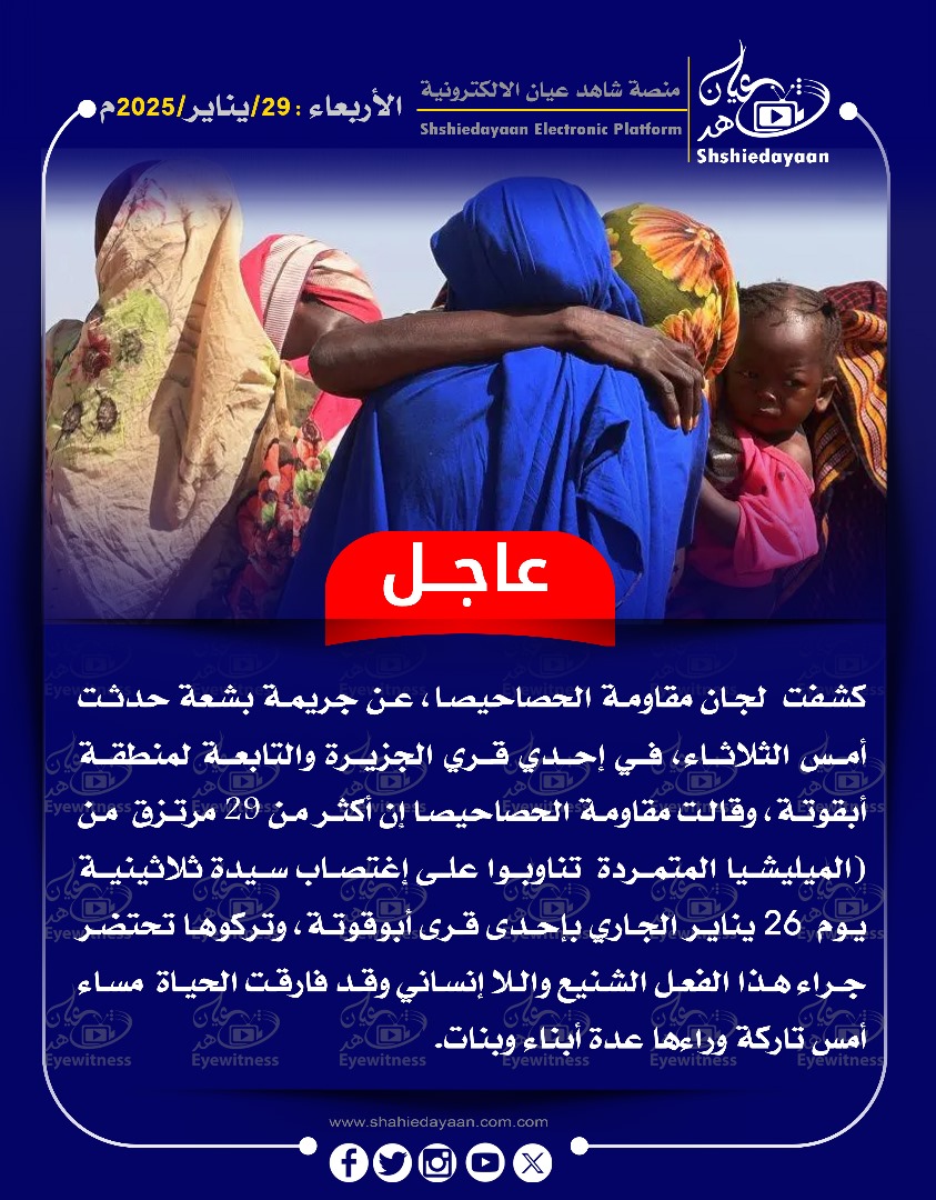 خبر في صورة الأخبار عاجل … كشفت لجان مقاومة الحصاحيصا ، عن جريمة بشعة حدثت أمس الثلاثاء، في إحدي قري الجزيرة شاهد عيان يناير 29, 2025 0 أقرأ المزيد ..