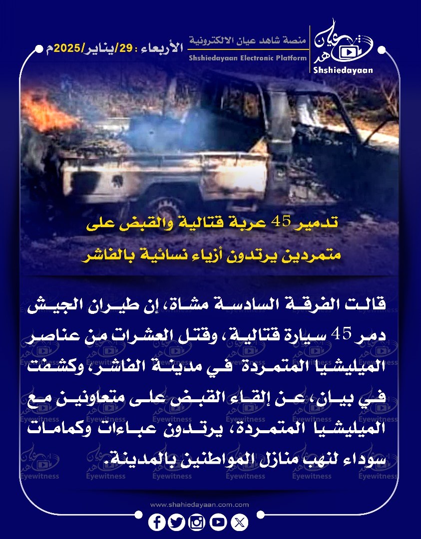 خبر في صورة الأخبار تدمير 45 عربة قتالية والقبض على متمردين يرتدون أزياء نسائية بالفاشر شاهد عيان يناير 29, 2025 0 أقرأ المزيد ..