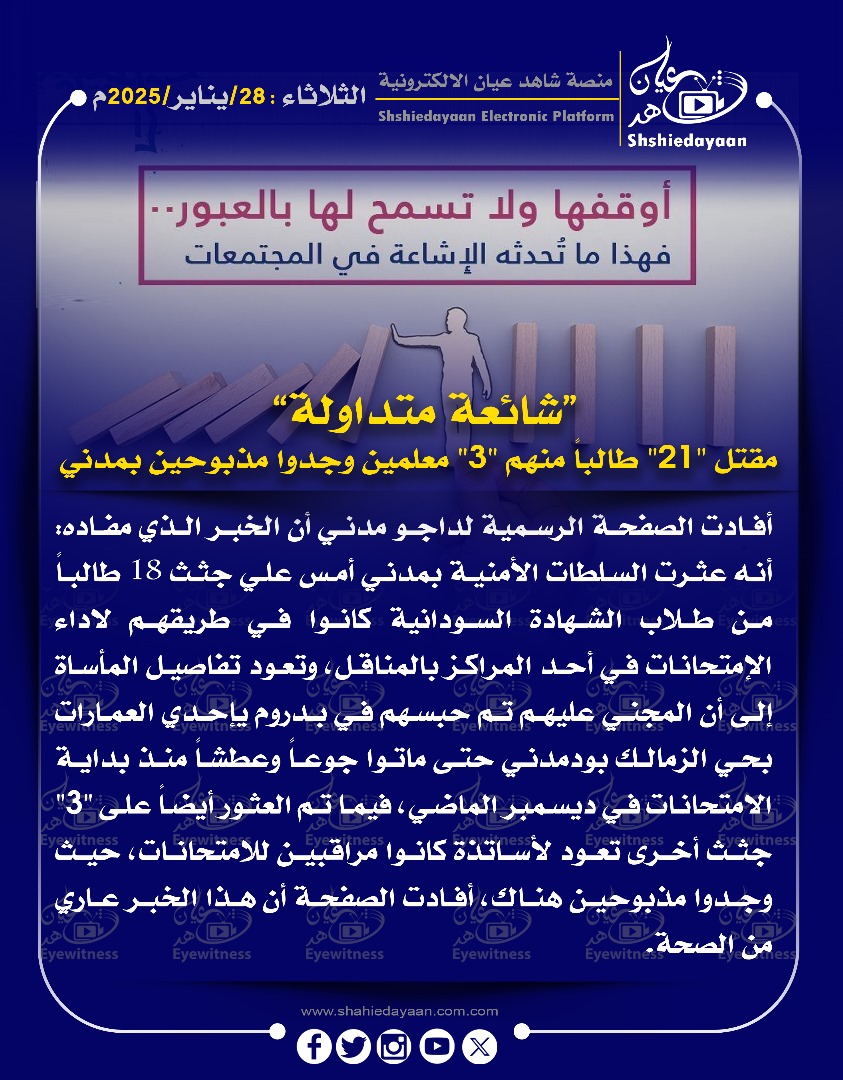 خبر في صورة الأخبار “شائعة متداولة” مقتل “21” طالبا منهم “3” معلمين وجدوا مذبوحين بمدني شاهد عيان يناير 28, 2025 0 أقرأ المزيد ..