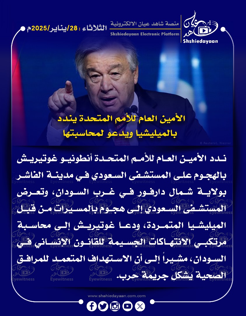 خبر في صورة الأخبار الأمين العام للأمم المتحدة يندد بالميليشيا ويدعو لمحاسبتها شاهد عيان يناير 28, 2025 0 أقرأ المزيد ..