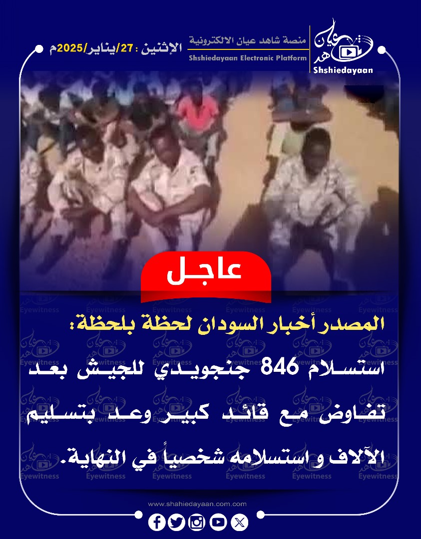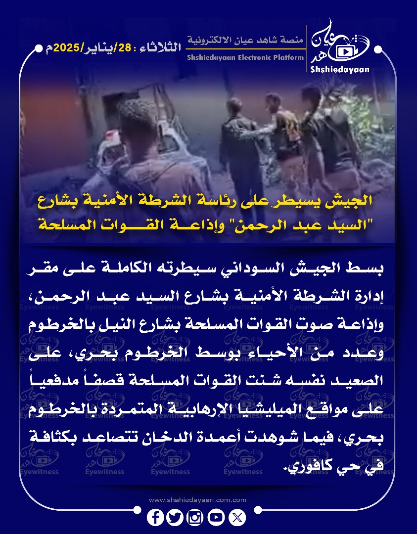 خبر في صورة الأخبار الجيش يسيطر على رئاسة الشرطة الأمنية بشارع “السيد عبد الرحمن” وإذاعة القوات المسلحة شاهد عيان يناير 28, 2025 0 أقرأ المزيد ..