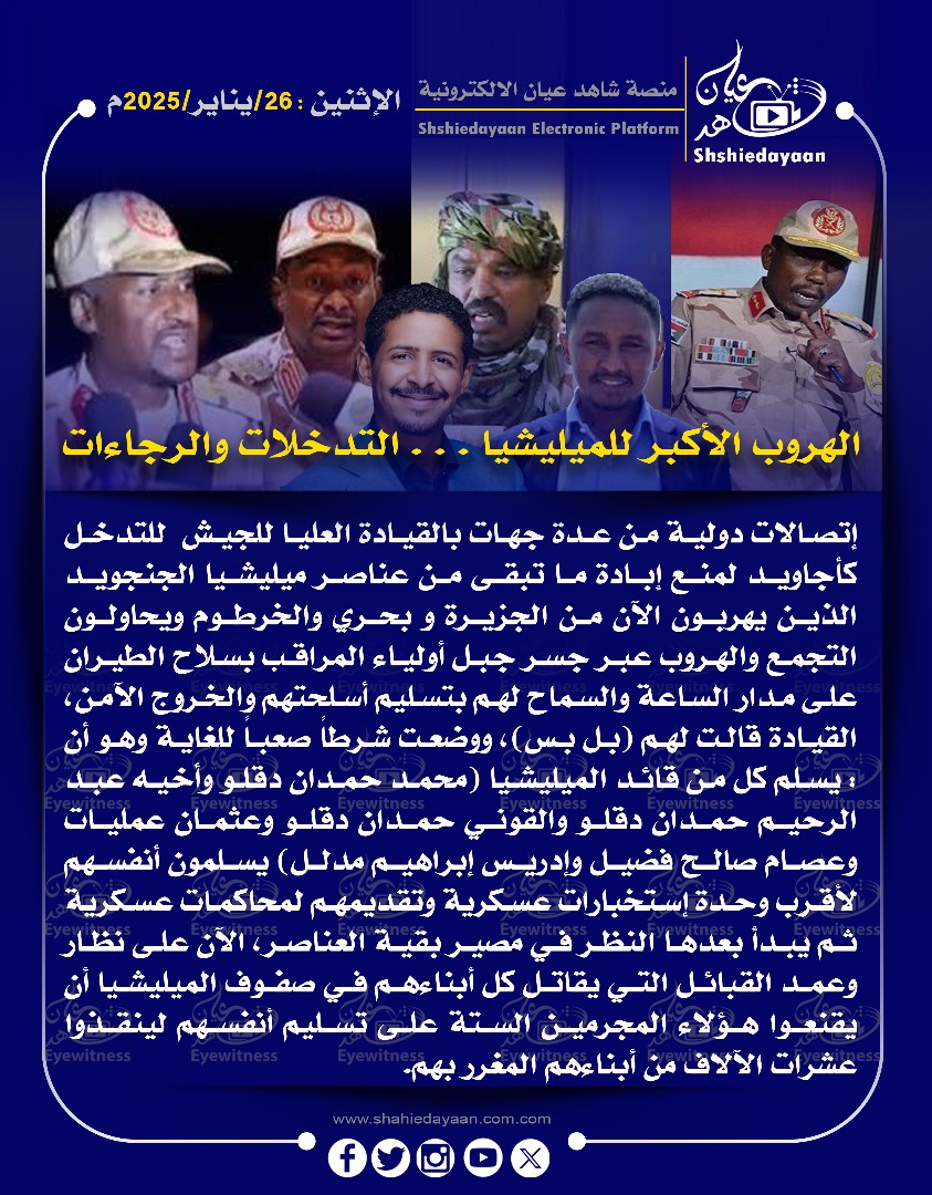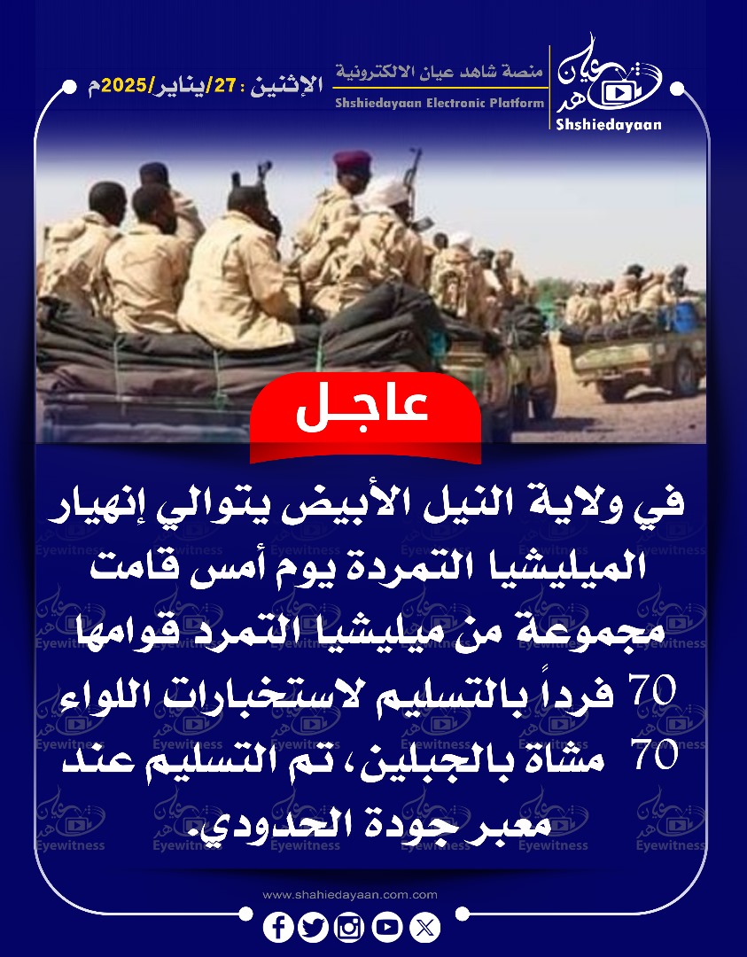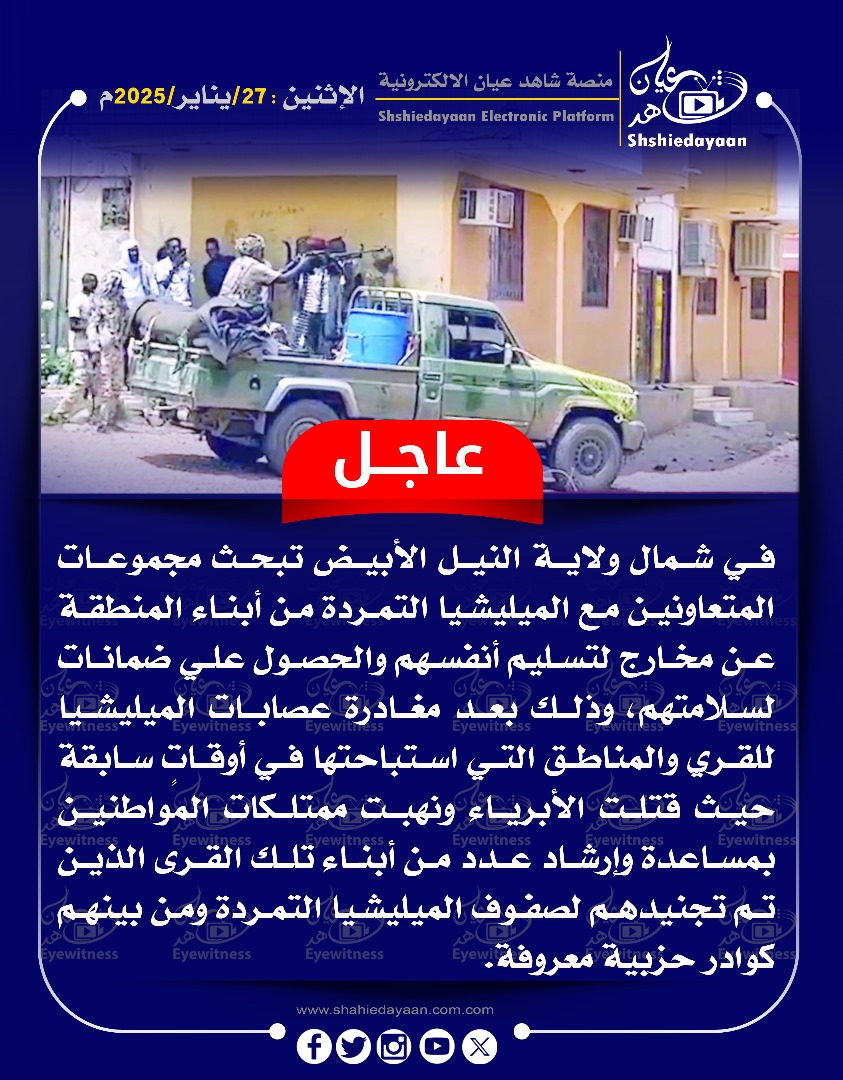 خبر في صورة الأخبار عاجل .. في شمال ولاية النيل الأبيض تبحث مجموعات المتعاونين مع الميليشيا التمردة من أبناء المنطقة عن مخارج لتسليم أنفسهم والحصول علي ضمانات لسلامتهم، شاهد عيان يناير 27, 2025 0 أقرأ المزيد ..