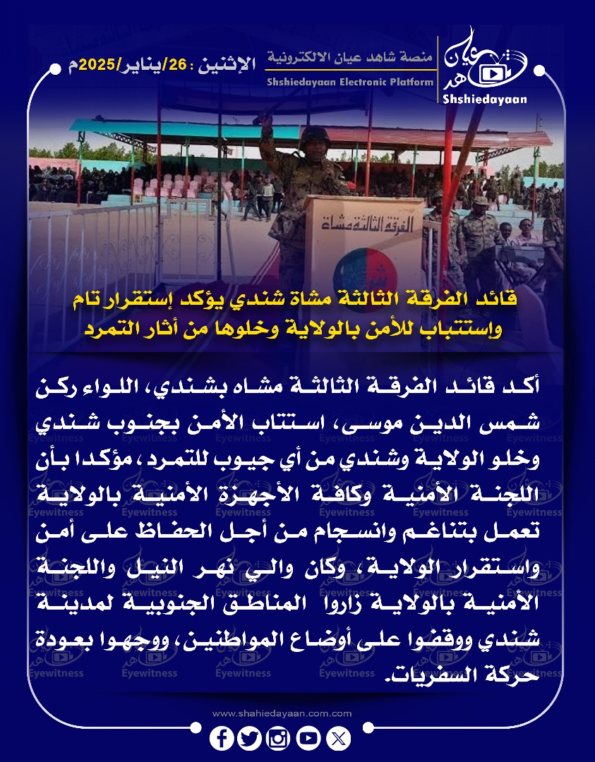 خبر في صورة الأخبار قائد الفرقة الثالثة مشاة شندي يؤكد إستقرار تام واستتباب للأمن بالولاية وخلوها من أثار التمرد شاهد عيان يناير 27, 2025 0 أقرأ المزيد ..