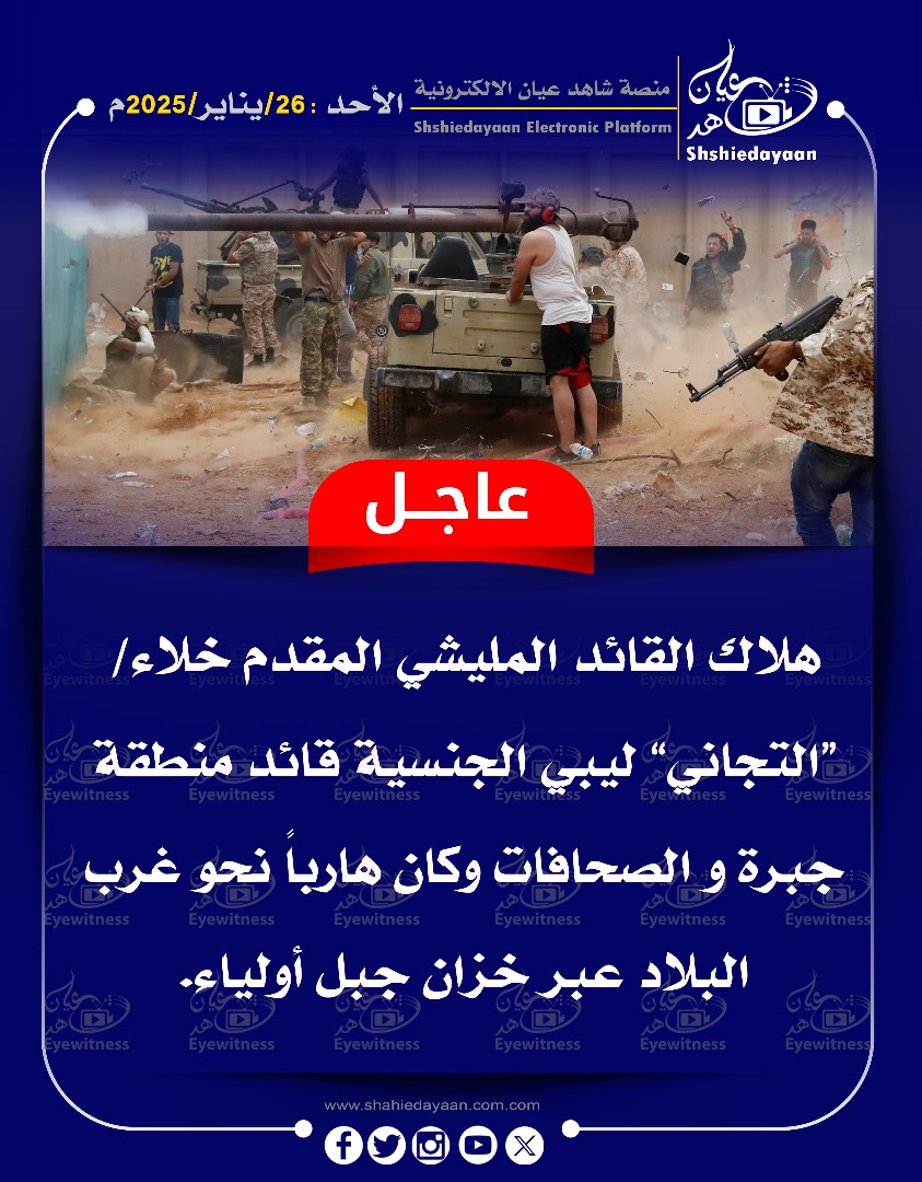 خبر في صورة الأخبار هلاك القائد المليشي المقدم خلاء “التجاني” ليبي الجنسية شاهد عيان يناير 26, 2025 0 أقرأ المزيد ..