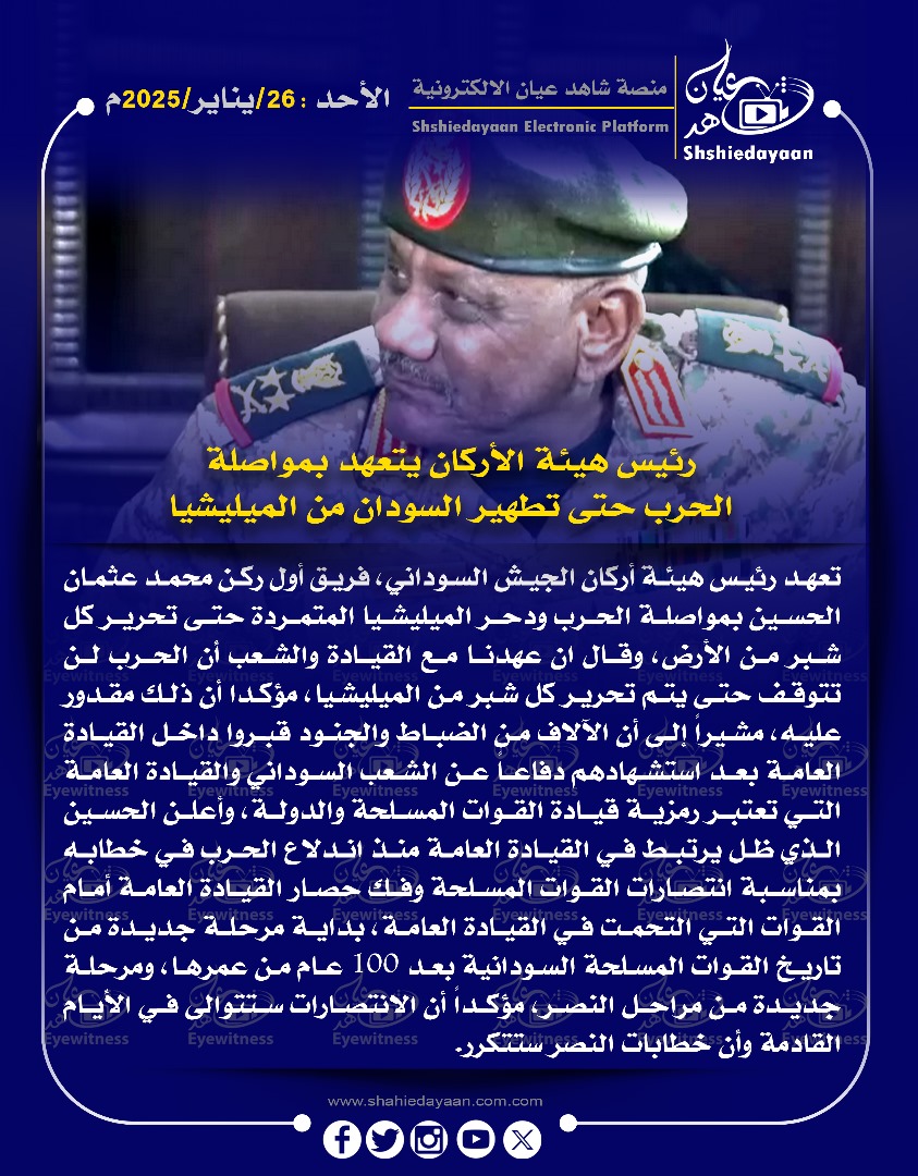خبر في صورة رئيس هيئة الأركان يتعهد بمواصلة الحرب حتى تطهير السودان من الميليشيا شاهد عيان يناير 26, 2025 0 أقرأ المزيد ..