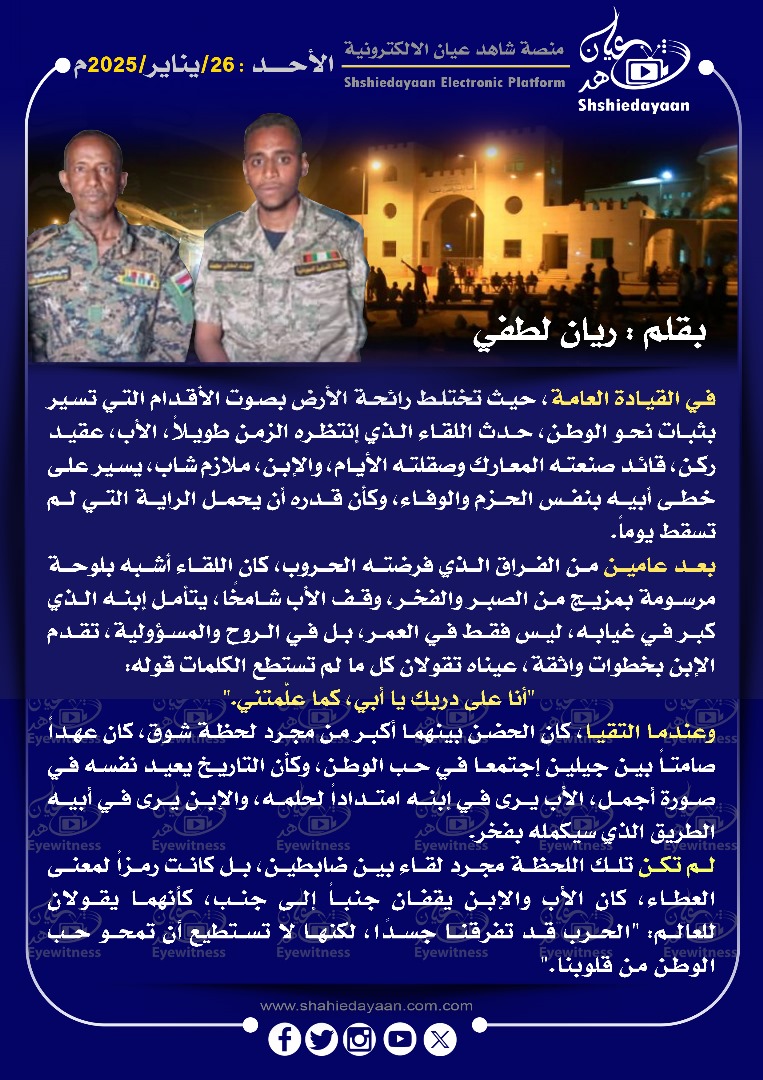 خبر في صورة في القيادة العامة حدث اللقاء الذي انتظره الزمن طويلاً، الأب، عقيد ركن، قائد صنعته المعارك وصقلته الأيام، والإبن ، ملازم شاب، يسير على خطى أبيه بنفس الحزم والوفاء، وكأن قدره أن يحمل الراية التي لم تسقط يوما شاهد عيان يناير 26, 2025 0 أقرأ المزيد ..